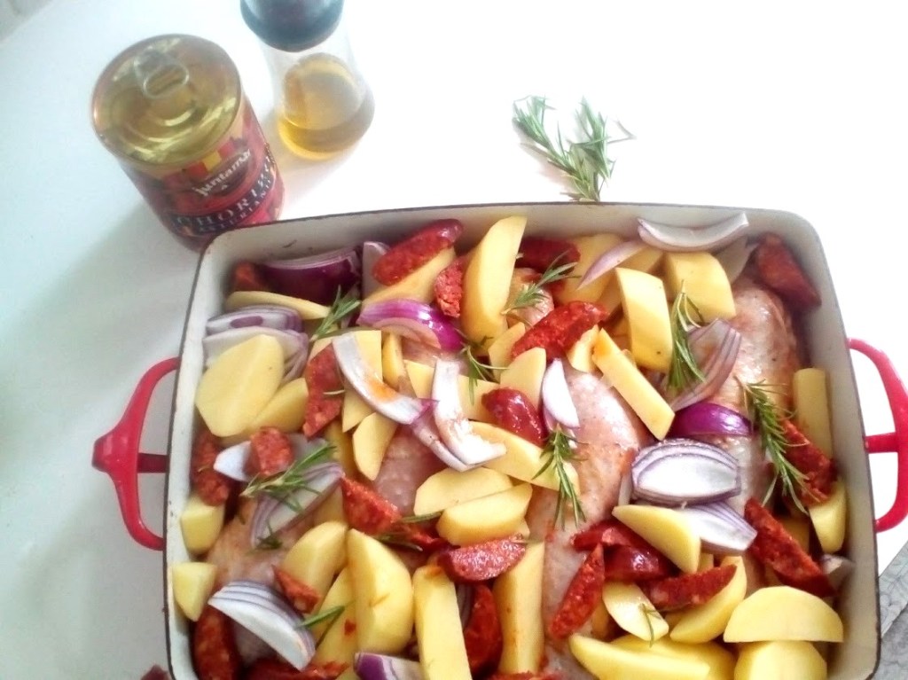 チョリソーのトレイベイクはとても簡単。骨付きチキンにジャガイモ、紫タマネギ、ハーフドライトマトのオリーブオイル漬け、それに今回は生チョリソーが見つからなかったので、スペインのチョリソー缶詰で代用。これが結構驚くほどスパイシー💦 ローズマリーは庭の花壇でガンガン育ち、毎年切ってはコンポスト山に放り捨てるほどなので、うちではどのベーキングにも思いっきり突っ込みます。